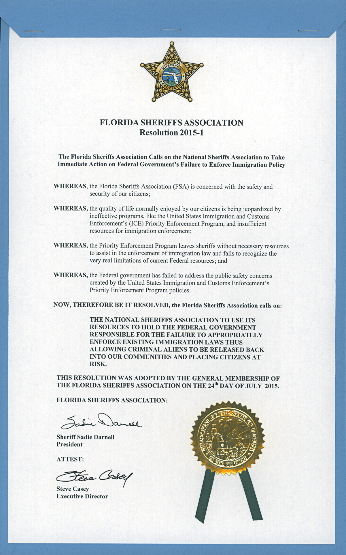 Resolution Calling for the National Sheriffs Association to Take Immediate Action on the Federal Government’s Failure to Enforce Immigration Policy